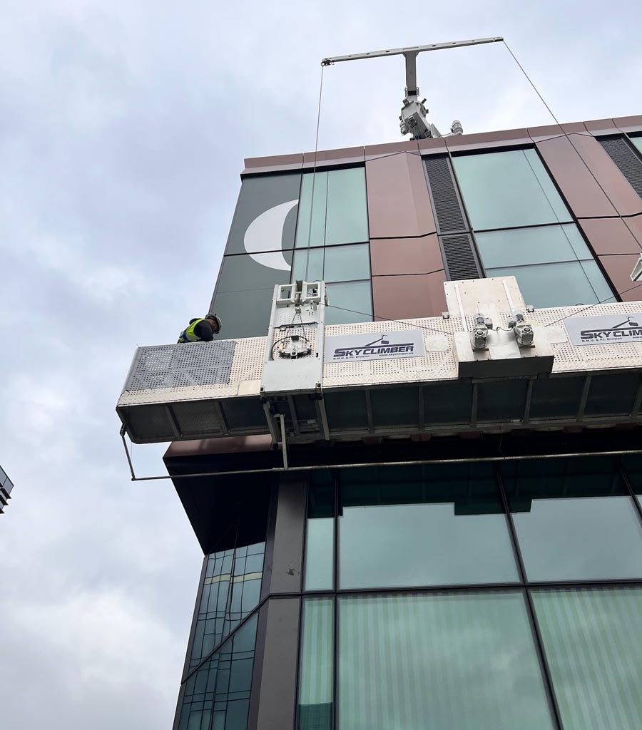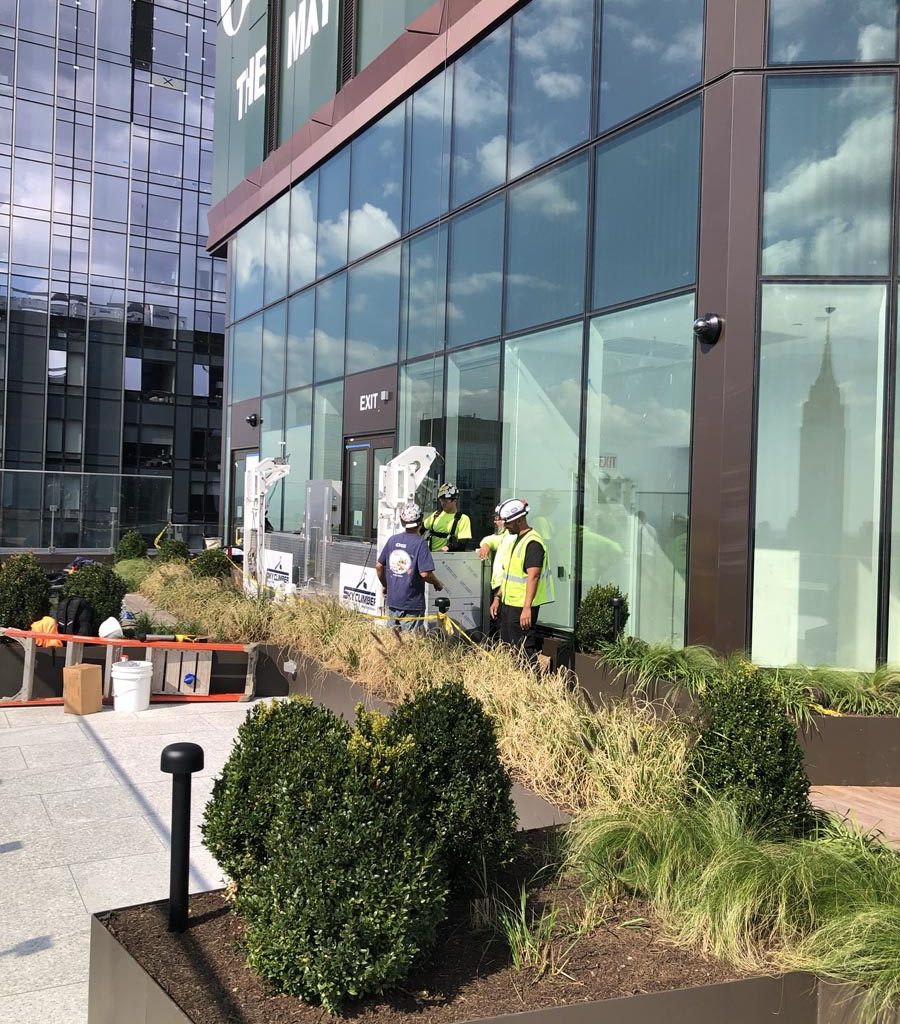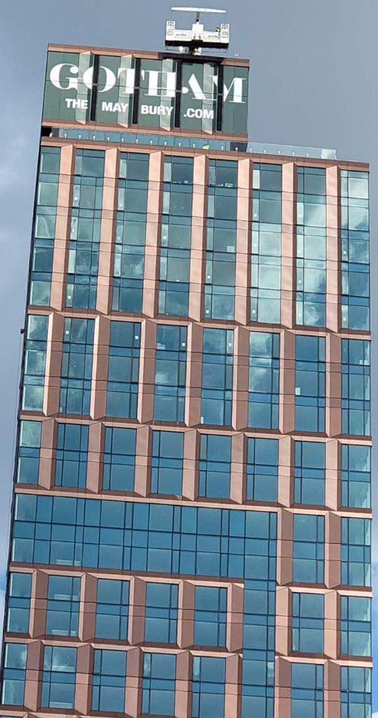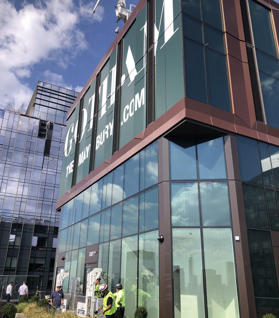 In the wake of an embarrassing crane collapse, the now completed Maybury, a residential high rises at 550 10th ave. began signing up renters. The Maybury’s marketing team asked us to wrap the bulkhead above their luxury roofdeck to let the Hudson Yard set know about the offerings just 8 blocks north. We used the building’s window washing rig–under profound safety scrutiny–to install the promotional graphic on the bulkhead’s cladding.