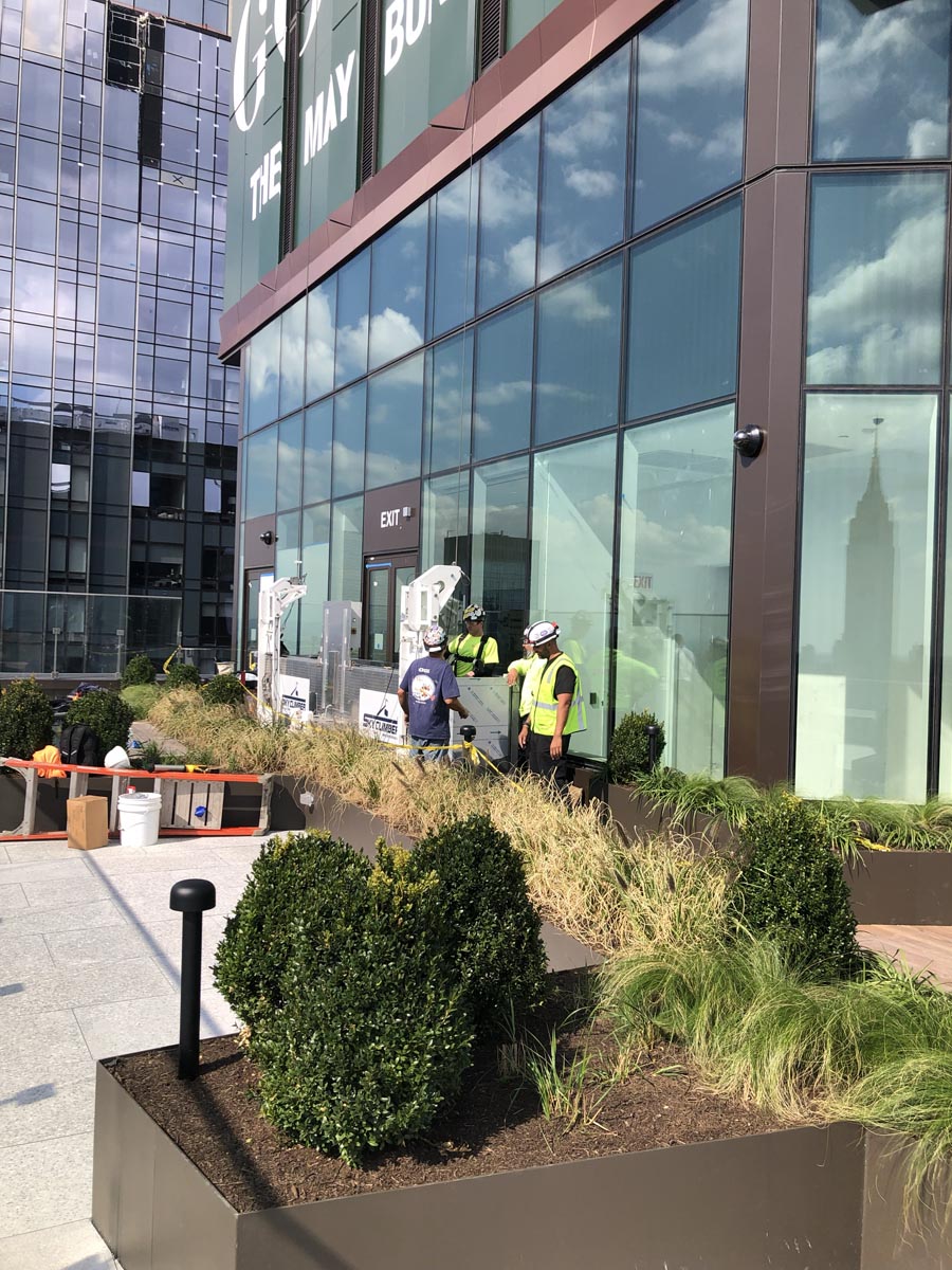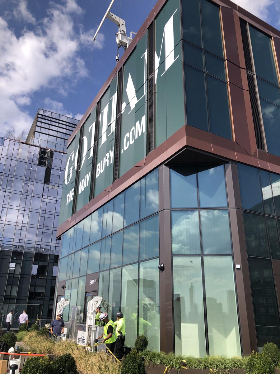 In the wake of an embarrassing crane collapse, the now completed Maybury, a residential high rises at 550 10th ave. began signing up renters. The Maybury’s marketing team asked us to wrap the bulkhead above their luxury roofdeck to let the Hudson Yard set know about the offerings just 8 blocks north. We used the building’s window washing rig–under profound safety scrutiny–to install the promotional graphic on the bulkhead’s cladding.